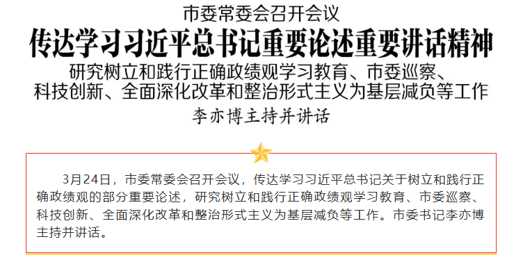 会议传达学习习近平总书记关于树立和践行正确政绩观的部分重要论述,研究树立和践行正确政绩观学习教育工作,强调要准确领会和把握正确政绩观的丰富内涵和实践要求,紧扣“立党为公、为民造福、科学决策、真抓实干”总要求,坚持以上率下、分类施策,强化警示教育、正向引导,一体推进学习研讨、查摆问题、整改整治、建章立制、开门教育等重点任务,推动学习教育扎实开展、取得实效。要对标对表政绩观偏差主要问题清单,以严的标准和实的要求,持续深入查摆问题,动态完善问题清单和整改台账,切实做到边查边改、立行立改。要坚持以学促干、以知促行,聚焦推动发展、保障民生、维护稳定,促进学习教育与“三十工程”、“345”创新行动、“3+13+N”重点产业链群培育等全市中心工作协同共进,切实把学习成果转化为为人民出政绩、以实干出政绩的行动和成效,确保我市“十五五”经济社会发展实现良好开局。