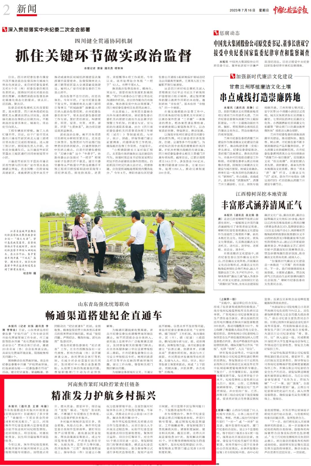 7月16日,《中国纪检监察报》二版刊发消息《河南焦作紧盯风险拧紧责任链条 精准发力护航乡村振兴》,报道了我市纪检监察机关围绕重点项目、重大资金、重要环节,积极开展乡村振兴领域不正之风和腐败问题专项整治,以有力监督护航乡村振兴的经验做法。全文如下: