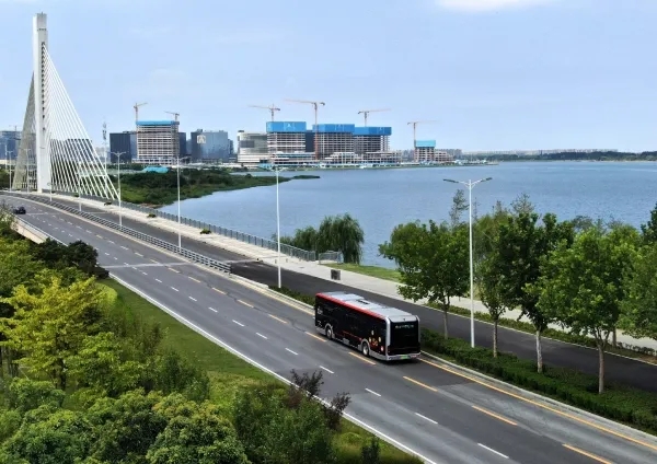 近年来,河南省郑州市高新区抢抓机遇、全面布局,一系列技术成果的应用彰显高质量发展的澎湃动力。图为河南省郑州市郑东新区自动驾驶公交1号线车辆行驶在试运行的道路上。新华社记者 李安 摄