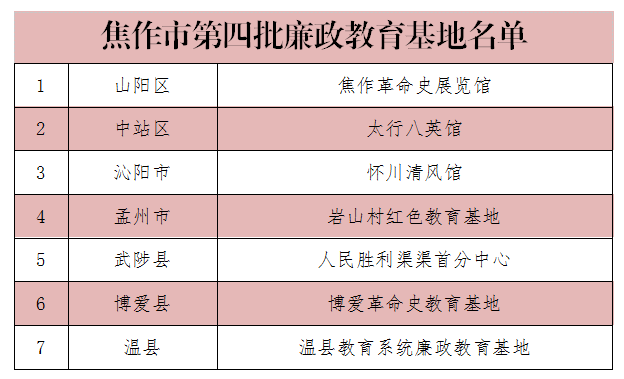 近日,为贯彻落实中央办公厅《关于加强新时代廉洁文化建设的意见》,持续拓宽廉政教育阵地和载体,根据《焦作市廉政教育基地创建与管理办法》,经市纪委常委会会议研究,决定命名焦作革命史展览馆等7个场所为焦作市第四批廉政教育基地。