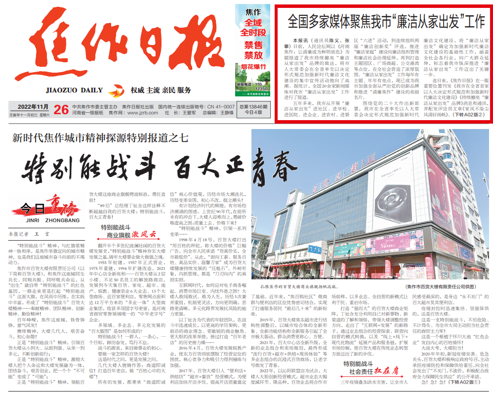 连日来,《焦作日报》在一版重要位置刊发《我市在全省首家以人大决定形式规范和加强新时代廉洁文化建设》《持续擦亮“廉洁从家出发”品牌》消息和通讯,并配发评论员文章《家风不染尘 风清好扬帆》。