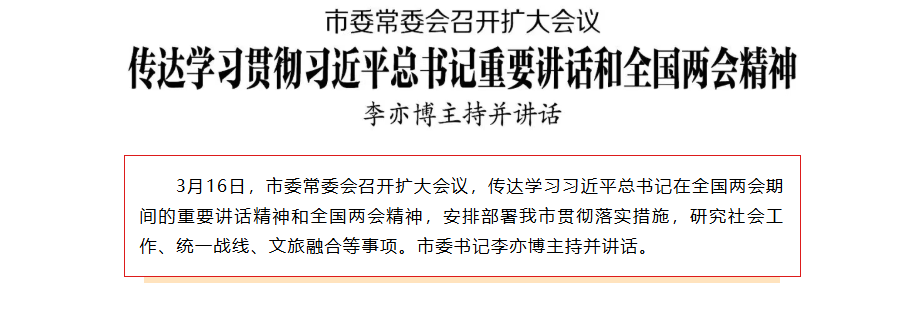 会议传达学习习近平总书记在全国两会期间的重要讲话精神和全国两会精神。会议指出,今年全国两会是在中国共产党成立105周年、“十五五”开局之年召开的一次十分重要的会议。习近平总书记在全国两会期间发表的重要讲话,高屋建瓴、总揽全局、内涵丰富,为我们做好当前和“十五五”时期经济社会发展工作指明了前进方向、提供了根本遵循。要站在坚定捍卫“两个确立”、坚决做到“两个维护”的政治高度,准确领会把握习近平总书记重要讲话的丰富内涵、精神实质和实践要求,紧密结合学习贯彻习近平总书记在河南考察时重要讲话精神和关于河南工作的重要论述,增强政治自觉、思想自觉和行动自觉,不折不扣推动全国两会精神在焦作落实见效,努力走好资源型城市转型创业创新创造高质量发展新路,在奋力谱写中原大地推进中国式现代化新篇章中奋勇争先、更加出彩。会议强调,要更加注重抢抓政策机遇,持续扩大有效需求。要密切关注、持续深化宏观政策研究和工作衔接,以“三十工程”为牵引,精准谋划储备重点项目,提升项目成熟度与落地转化率,促进重点项目建设提质增效,切实把政策“含金量”转化为发展实效。要深入实施提振消费专项行动和服务消费提质惠民行动,持续激发消费潜能。要更加注重聚焦重点突破,纵深推进融入服务全国统一大市场。要全面落实“五统一、一开放”基本要求,着力在破卡点、强联通、建枢纽、增动力、提能级上下功夫,聚力年度重点事项持续攻坚突破,努力在融入服务全国统一大市场中展现更大作为、积蓄发展势能。要更加注重向新向优发展,着力构建现代化产业体系。要深入实施“345”创新行动,深化“3+13+N”重点产业链群培育,扎实做好“原字号”“老字号”“新字号”“外字号”四篇文章,促进科技创新和产业创新深度融合,加快构建以先进制造业为骨干、以现代服务业为依托的现代化产业体系。要更加注重坚持生态优先,加快经济社会绿色转型。要协同推进降碳减污扩绿增长,突出抓好“六源治本”持久提升行动,统筹山水林田湖草沙一体化保护和系统治理,促进重点行业节能降碳改造,厚植高质量发展绿色底色。要更加注重增强群众体感,以更大力度保障改善民生。要深入开展美好城市建设和美好生活提质行动,高质量抓好省市重点民生实事,加强普惠性基础性兜底性民生建设,不断增进民生福祉。要更加注重统筹发展安全,切实维护社会大局和谐稳定。要全面落实总体国家安全观,聚焦经济金融、安全生产和社会稳定等重点领域,严密防范化解各类风险隐患,促进高质量发展和高水平安全良性互动。会议要求,要扎实开展树立和践行正确政绩观学习教育,对标对表全国两会确定的各项目标任务,细化分解任务,拧紧责任链条,完善推进举措,凝心聚力推动各项工作往实里抓、向目标奔,奋力实现全年经济社会发展目标任务,确保焦作“十五五”开好局起好步。