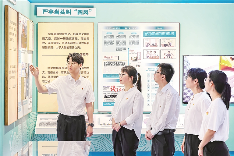 党的十八大以来,我们党不断推进党的政治建设、思想建设、组织建设、作风建设、纪律建设,把制度建设贯穿党的各项建设,开展史无前例的反腐败斗争,在构建全面从严治党体系上积累了丰富成果。图为近日,浙江省淳安县纪委监委干部在省法纪教育基地参观全面从严治党成就展。谢航凯 摄