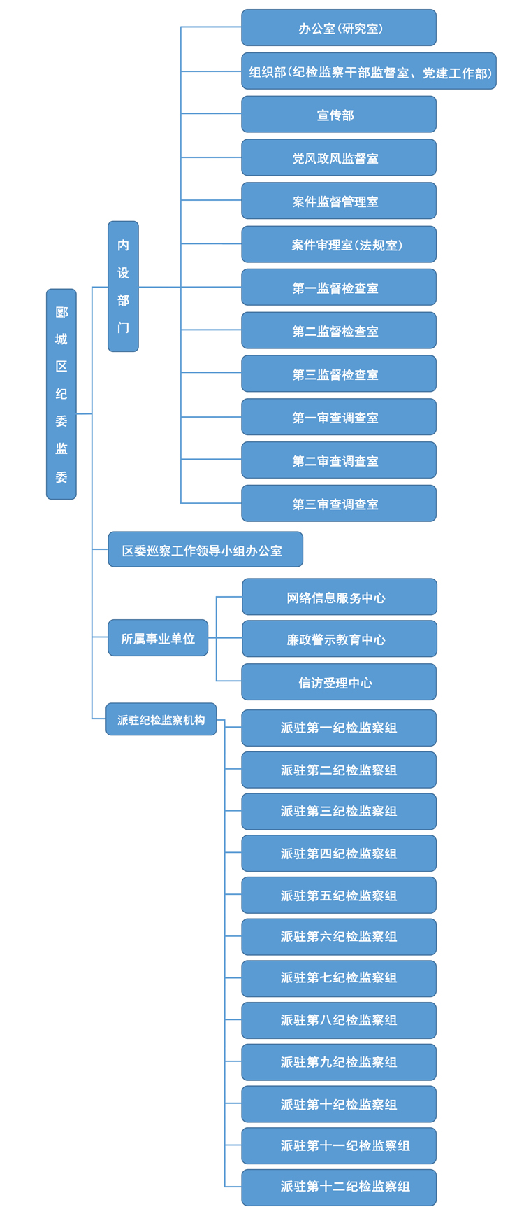 郾城区纪委机关与郾城区监委合署办公,共有12个内设机构,具体为办公室(研究室)、组织部(纪检监察干部监督室、党建工作部)、宣传部、党风政风监督室、案件监督管理室、案件审理室(法规室)、第一监督检查室、第二监督检查室、第三监督检查室、第一审查调查室、第二审查调查室、第三审查调查室。下属3个事业单位:网络信息服务中心,廉政警示教育中心、信访受理中心。实行统一管理的派驻纪检监察组12个。