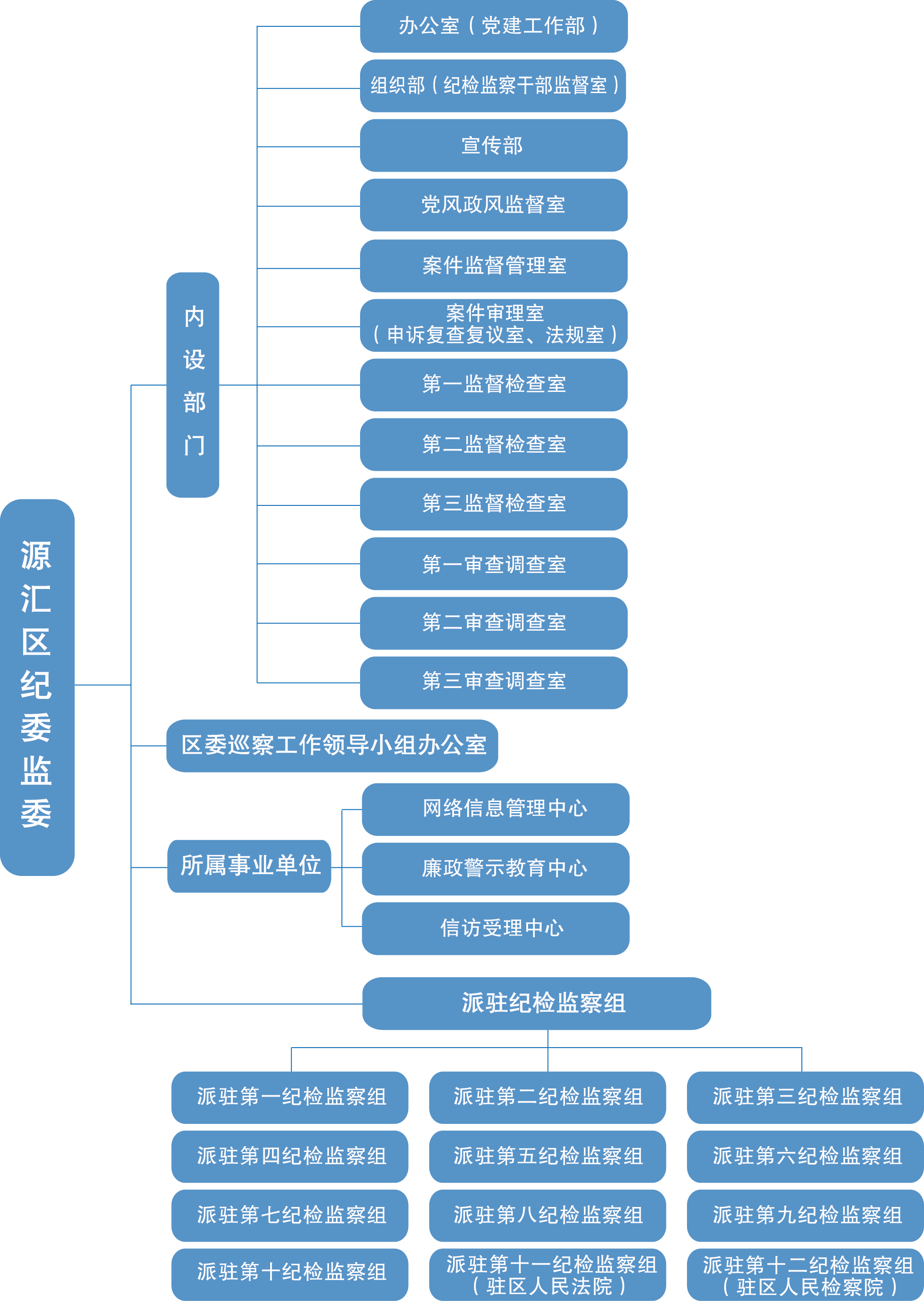 源汇区纪委机关与源汇区监察委合署办公,共有12个内设机构,具体为办公室(党建工作部)、组织部(纪检监察干部监督室)、宣传部、党风政风监督室、案件监督管理室、案件审理室(申诉复查复议室、法规室)、第一监督检查室、第二监督检查室、第三监督检查室、第一审查调查室、第二审查调查室、第三审查调查室。下属3个事业单位:网络信息管理中心,廉政警示教育中心、信访受理中心。实行统一管理的派驻纪检监察组12个。