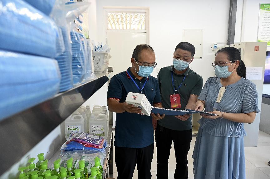 源汇区纪委监委派驻第九纪检监察组在许慎小学查看疫情防控物资储备情况。