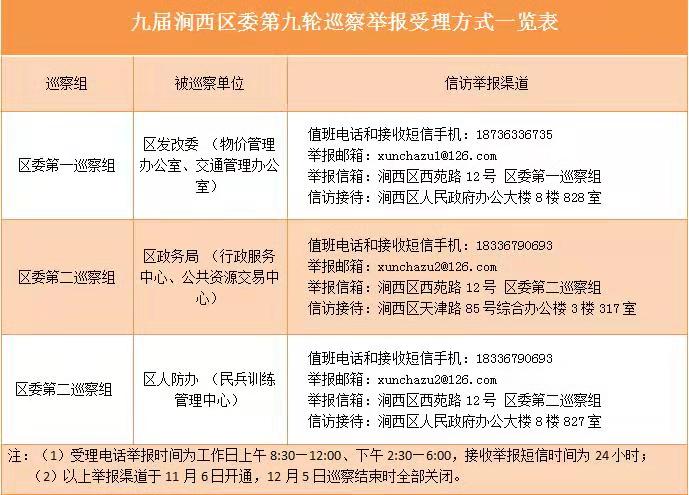 巡察期间,区委各巡察组均开通专门的值班电话,接收短信手机、电子邮箱,举报信箱设置在各巡察组驻地及被巡察单位。