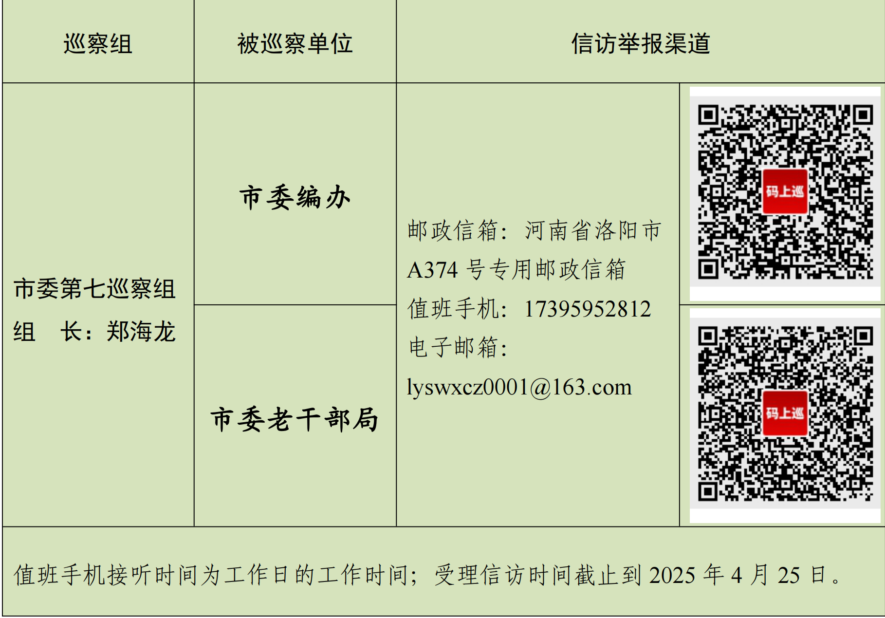 据悉,7个市委巡察组将现场巡察50天左右。期间设立邮政信箱、值班手机、电子邮箱和“码上巡”,主要受理反映被巡察党组织领导班子及其成员,下一级党组织主要负责人和重点岗位人员的来信来电来访,重点是关于违反政治纪律、组织纪律、廉洁纪律、群众纪律、工作纪律和生活纪律等方面的举报和反映。巡察组受理信访时间截止到2025年4月25日。(李梦醒)