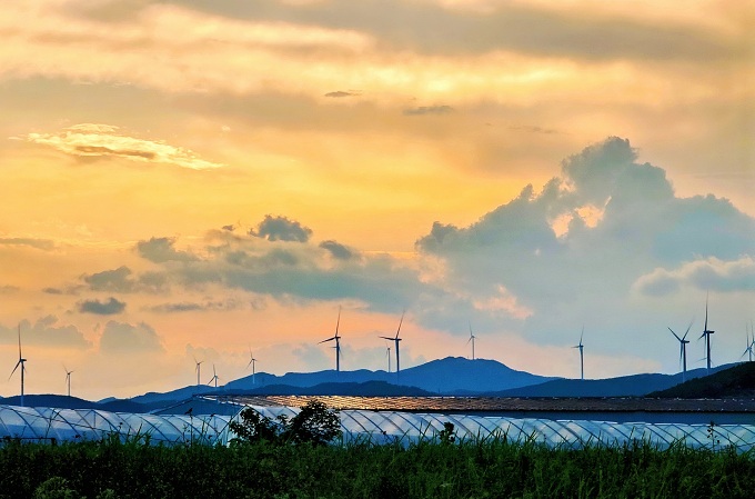 暑气蒸腾着金云流风,漫天云霞泼洒而下,给光伏板与棚顶镀上一层暖光,风电叶片悠悠旋过天际,描绘出一幅美丽的画卷。(舞钢市纪委监委 马双军 摄)