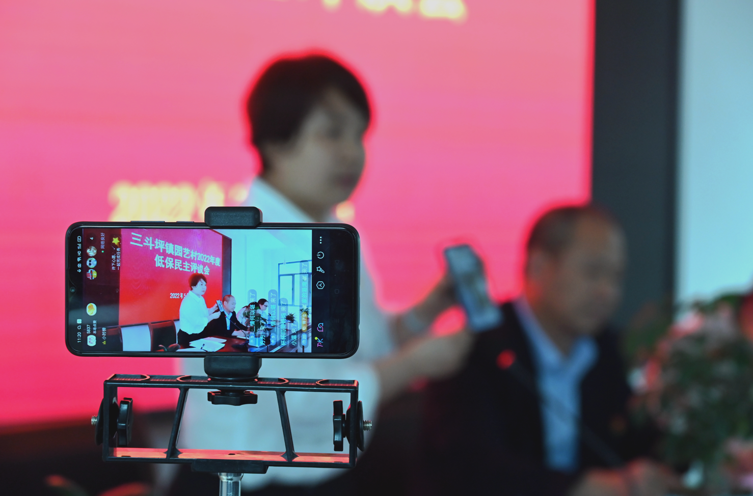 湖北省宜昌市夷陵区纪委监委利用信息技术手段赋能村居事务公开,指导镇村探索村务直播、线上公开等新形式,汇聚群众监督正能量,让小微权力在公开透明的环境下规范运行。图为该区三斗坪镇园艺村通过网络直播全程公开低保民主评议会,接受村民和社会监督。(湖北省宜昌市夷陵区纪委监委供 李欣颖 摄)