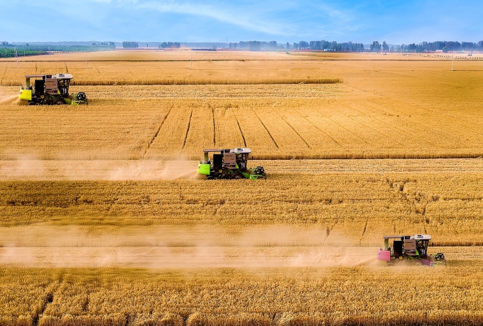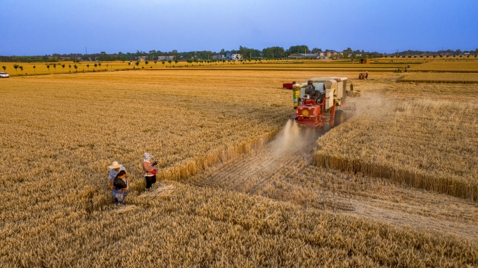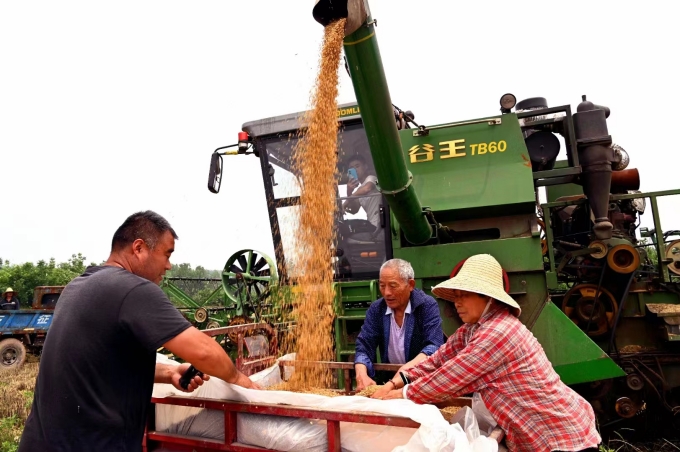 芒种时节,广袤的田野上收割机往来穿梭,田间地头到处一派繁忙景象。(新密市纪委监委 朱留波 摄)