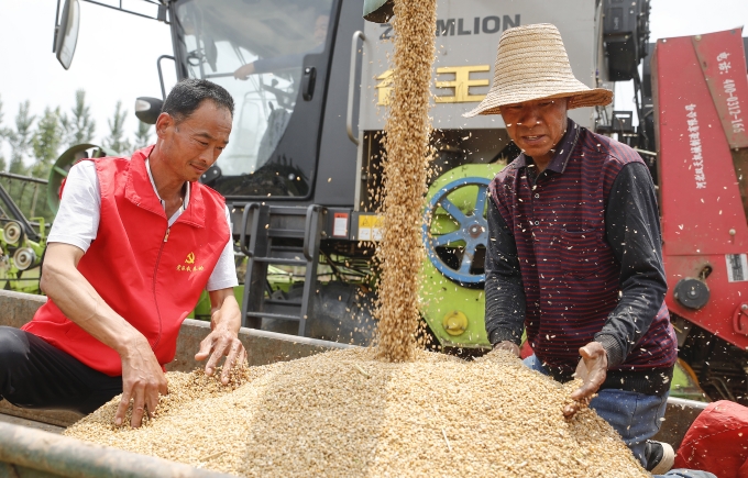 尉氏县南曹乡党员干部和帮扶队员帮助农户争分夺秒抢收小麦,确保夏粮颗粒归仓。(尉氏县纪委监委 周长岭 摄)