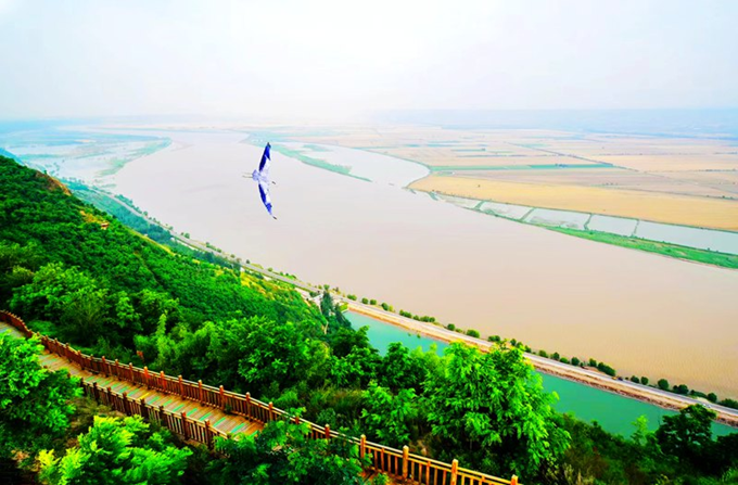 盛夏时分,灵宝市函谷关东寨村黄河观景台,树木青翠,碧水如玉,公路如飘带,黄河水如屏,白鹭时而低飞,时而冲上云霄,不时发出清脆的鸣叫,好一幅山青水秀鸟翩跹的优美画卷。(灵宝市纪委监委 花雪红 摄)