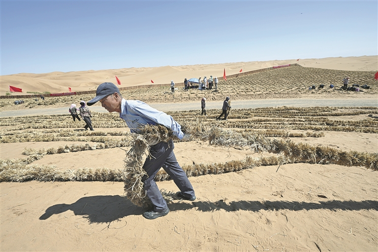 图为当日,治沙工人在位于长流水村的腾格里沙漠东南缘扎草方格。 新华社记者 王鹏 摄