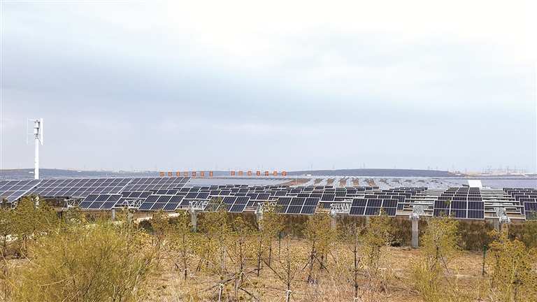 内蒙古自治区鄂尔多斯市杭锦旗库布其沙漠腹地,一块块蓝色光伏板在绵延不断的沙丘中列阵排开。光伏板下,顽强的沙蒿和梭梭树在风沙中茁壮成长。这个光伏治沙项目,在治理10万亩沙地的同时,每年为蒙西电网源源不断地输送41亿千瓦时的绿色能源。“板上发电、板下种植、板间养殖、治沙改土、带动乡村振兴”,光伏治沙这一可持续循环的产业发展模式,正奏响“生态绿”与“光伏蓝”协同发展的交响曲,成为打好“三北”工程黄河“几字弯”攻坚战的生动注脚。