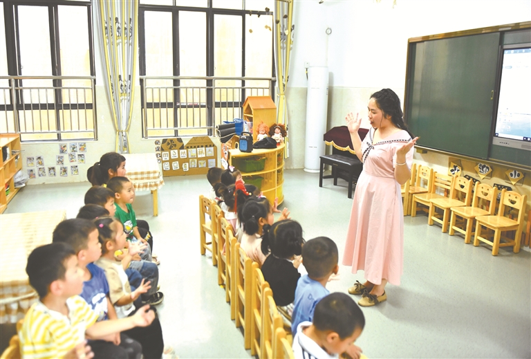 广西壮族自治区乐业县新化镇百坭村是“七一勋章”获得者黄文秀生前工作过的地方。近年来,在黄文秀先进事迹感染下,一批“80后”“90后”和“00后”,相继来到百坭村,他们把青春投入乡村振兴工作。如今,百坭村的面貌发生了翻天覆地的变化。 百坭村文秀幼儿园,31岁的黄光面带着小朋友们玩游戏。新华社记者 黄孝邦 摄