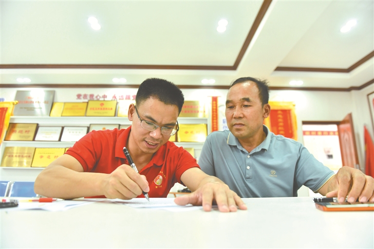 百坭村村“两委”办公室,34岁的驻村第一书记农俊海(左)为村民办事。 新华社记者 黄孝邦 摄