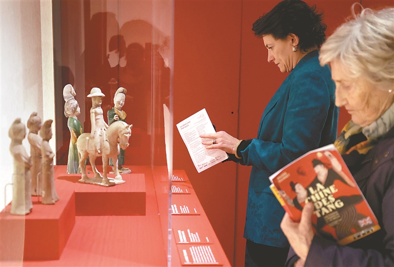 “中国·唐——一个多元开放的朝代(7至10世纪)”展览近日在法国吉美国立亚洲艺术博物馆开幕。图为人们在观看展览中的中国文物。 新华社记者 高静 摄