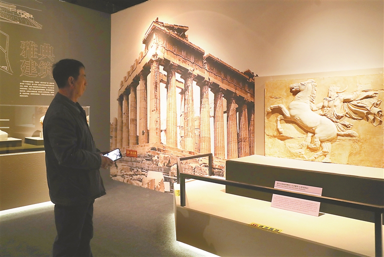近日,“希腊人——从阿伽门农到亚历山大”展览开幕式在北京首都博物馆举行。图为一名参观者在观看来自希腊卫城博物馆的藏品帕台农神庙西侧的八号浮雕带(石膏复制品)。 图片来源:视觉中国