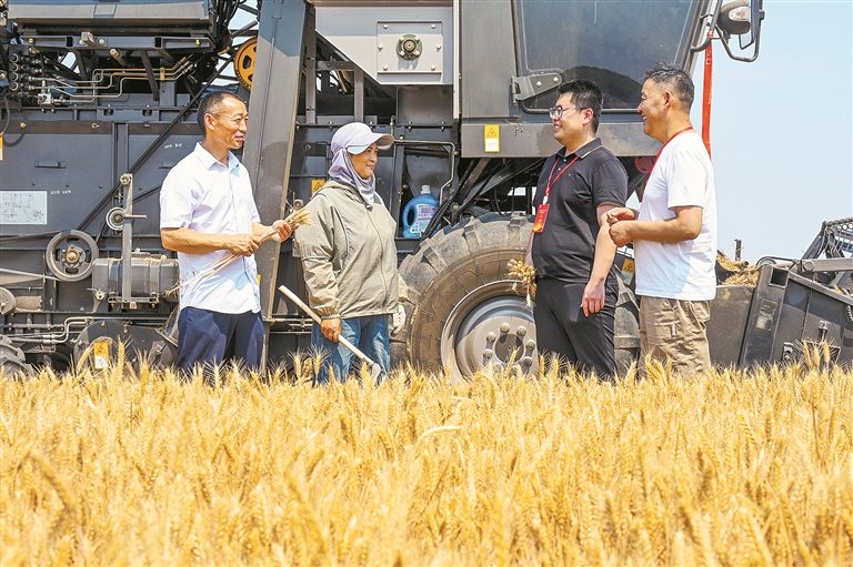 麦收时节,河南省漯河市源汇区纪委监委深入田间地头持续加强监督检查,压紧压实相关部门责任,督促职能部门履职尽责,为夏粮丰收保驾护航。图为5月26日,该区纪检监察干部在大刘镇板桥村小麦收割现场了解有关情况。尤亚辉 摄
