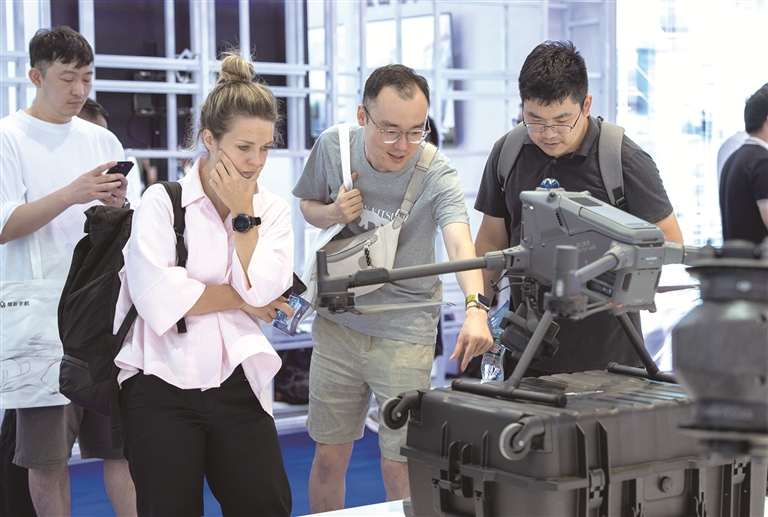 下图:近日,观众在博览会上了解一款无人机。新华社发(张悦 摄)