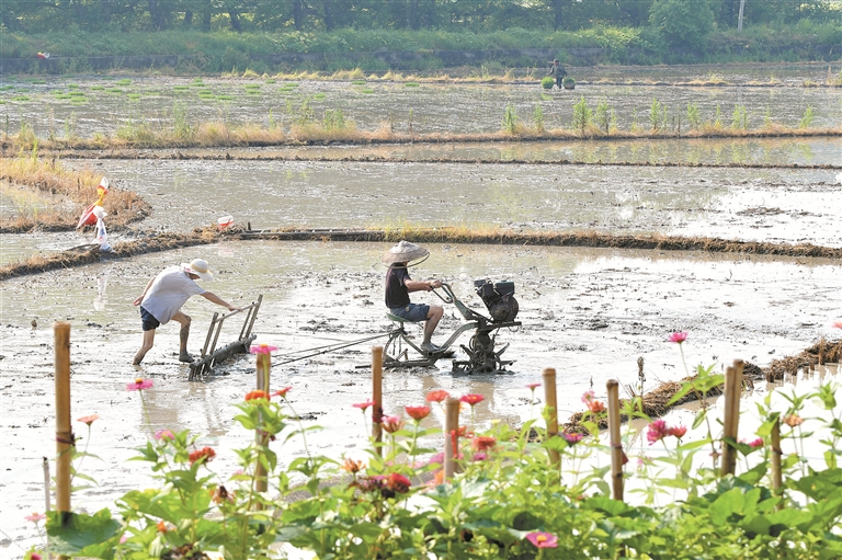 图为7月7日,湖南省娄底市双峰县井字镇花桥村,农民驾驶微耕机平整水田,准备栽插晚稻。 新华社发(李建新 摄)