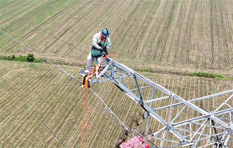 近日,在安徽省亳州市利辛县程家集镇,电力工人正在对辖区220千伏输电线路进行带电检修。 图片来源:视觉中国