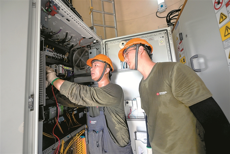 连日来,天津迎来持续高温天气,电力保供进入“迎峰度夏”关键期。图为近日,在国家能源集团天津龙源新能源有限公司大苏庄风电场,工作人员在风电机组内检查变电设备。 新华社记者 赵子硕 摄