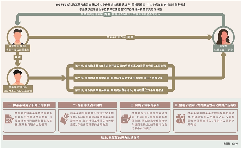 第三,研判是否使用非法占有的手段。贪污罪中的“骗取”不限于对财物管理者的欺骗,亦包括利用职务便利捏造虚假事实套取财产。本案中,林某某实施“造假三步走”:第一步,安排下属虚构陶某某与B县农业开发公司的劳动关系,伪造劳动合同、工资台账;第二步,安排下属虚增陶某某参保年限,将其实际未以职工身份参保年度计入缴费记录;第三步,安排下属经办陶某某退休事宜,帮助陶某某提前5年退休,并骗取9.2万余元养老金,上述行为是林某某出于主观故意实施的利用职务便利骗取公共财产的行为,依法应以贪污罪予以定性。