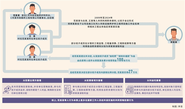 2009年至2024年,范某某与单位时任部分班子成员白某、王某等人共同利用职务便利,以班子会议形式,将郑某某名下公司及施工队列入市政设施养护所工程项目施工作业名单,将相关工程业务指定郑某某实施,部分班子成员在分管的工程监管、工程量测算、工程款结算等方面,利用各自职务便利分别为郑某某谋取利益。2009年至2024年,经范某某提议并决定,以发放班子成员“加班费”“绩效补差款”为由,由班子成员白某等人经手,从郑某某处累计收受现金100余万元,后经范某某决定在部分班子成员内部按比例分配,范某某实得27万元。