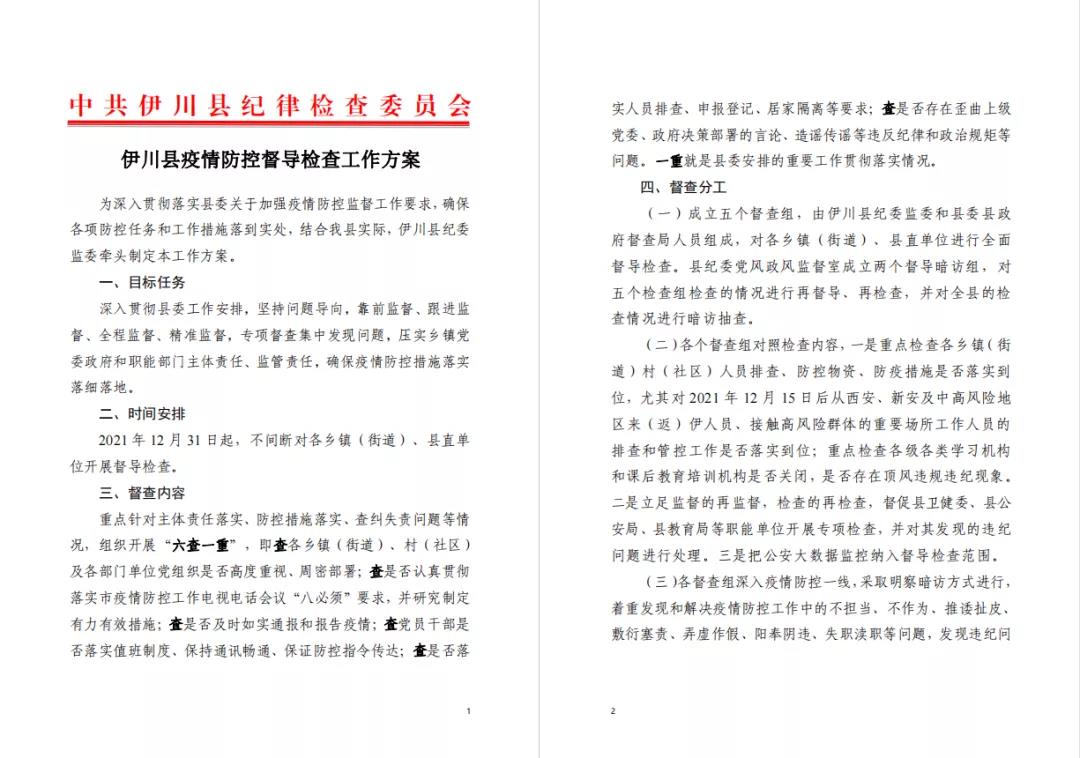 县纪委监委印发《伊川县疫情防控督导检查工作方案》