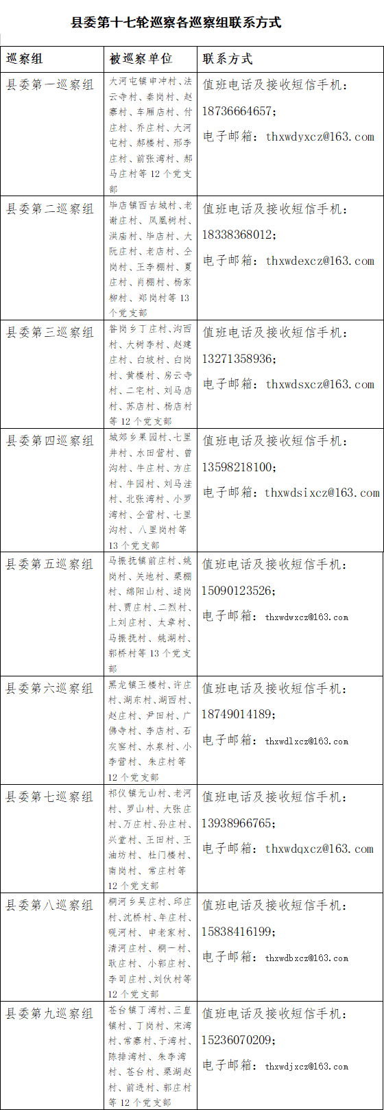 目前,县委9个巡察组信访举报联系方式已开通。巡察期间(2020年4月13日至5月27日,不含五一假期),各巡察组通过值班电话、短信、电子邮箱、征求意见箱等联系方式,于工作日上午8:00至12:00,下午14:30至17:30受理信访举报。对其他与巡察工作无直接关系的个人诉求、涉法涉诉等信访问题,将按照分级负责原则,转交有关单位办理。巡察组不接受任何个人查询,也不负责向反映人反馈有关情况。巡察结束时各信访平台自行关闭,不再受理信访事项。