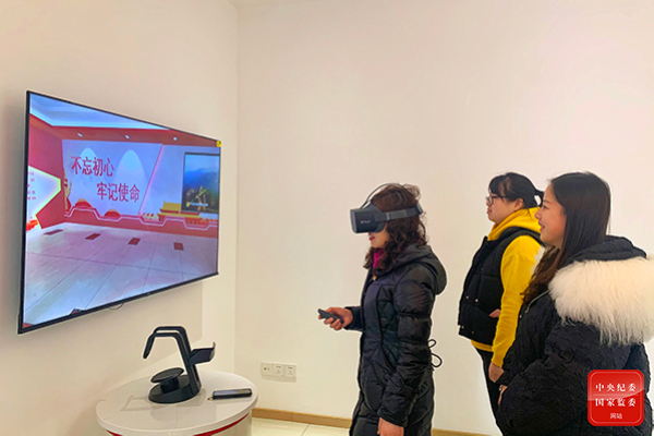 重庆市沙坪坝区纪检监察干部通过VR技术参观“不忘初心牢记使命”虚拟展厅,身临其境学习党史。(重庆市沙坪坝区纪委监委供 习永琼 摄)
