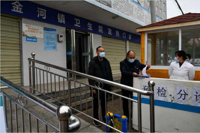 淅川县金河镇纪委工作人员对该镇卫生院疫情防控工作进行监督检查,保障各项防控措施落实落细。(淅川县纪委监委 宋莹莹 摄)