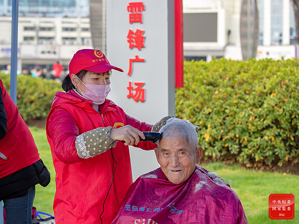 杭州市淳安县千岛湖镇专门设立“雷锋广场”,每逢节假日,广大志愿者会在“雷锋广场”开展理发、家电维修等便民活动,免费为市民服务。图为近日,志愿者在“雷锋广场”义务为老年人理发。(杭州市淳安县纪委监委供 鲍宇晗 摄)