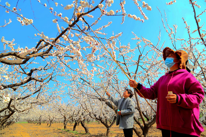 惊蛰时节,气温回暖,杏花、桃花相继开放,呈现生机勃勃的春日美景。豫东地区农民抢抓农时,伴着花香进行花期管理,力争有个好收成。(宁陵县纪委监委 吕忠箱 摄)
