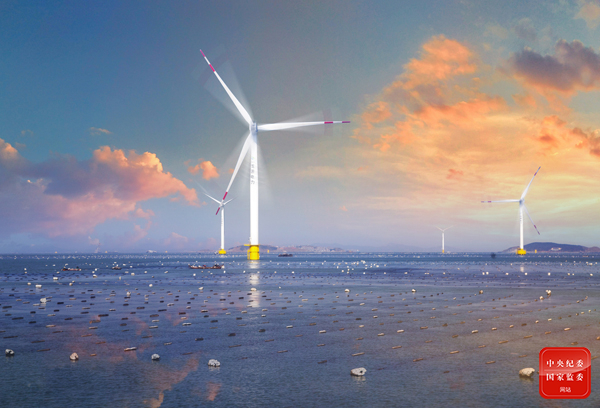 在福建省莆田市秀屿区南日岛东岱码头附近,白色电力风车持续运转,在源源不断地输送电力的同时,最大程度保留南日海岸原生态自然景观,共同绘就人与自然和谐共生的美好画卷。(福建省莆田市秀屿区纪委监委供 游荔生 摄)