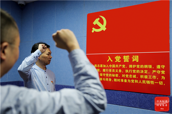 云南省曲靖市纪委监委有针对性地开展思想政治工作,用心用情感化、挽救审查调查对象,努力实现案件处理的政治效果、纪法效果、社会效果相统一。图为专案组人员与审查调查对象一起重温入党誓词。(云南省曲靖市纪委监委 伍中婷 摄)