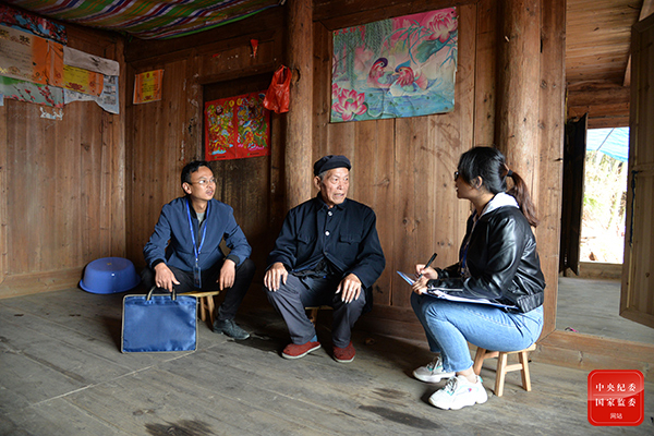 乡村两级换届期间,贵州省锦屏县纪委监委靠前监督,组织纪检监察干部入户走访,摸排干扰、破坏基层换届选举违纪违法行为,保障换届选举风清气正。图为县平秋镇纪检监察干部到高岑村了解情况。(贵州省锦屏县纪委监委 杨函祥 摄)
