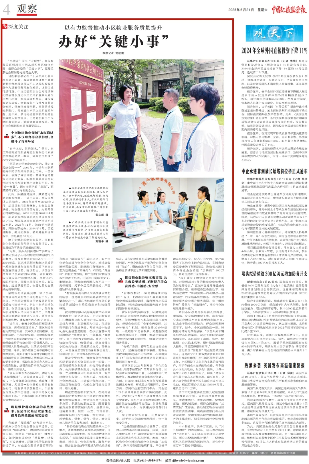小小物业事,关乎万家安。从“30分钟响应”的周到服务,到公告栏晒出的“明白账”;从归还居民的楼顶公共空间,到公共设施的维护提升……纪检监察机关监督执纪为民的努力,正化作千家万户门前的幸福底色。(管筱璞)