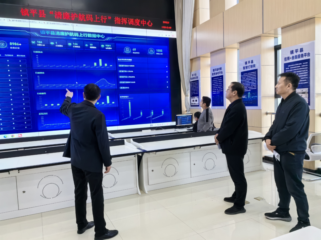 图为镇平县纪委监委相关负责同志实地察看“清廉护航码上行”执法监督APP后台运行情况。