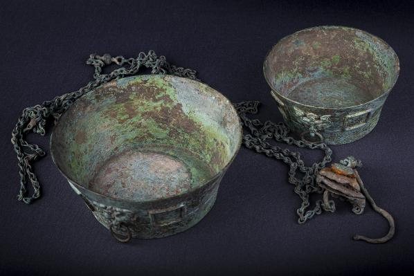 关于量器,古代文献多有记载,但遗留下来的实物极不多见。该量器一大两小,应为成套量器。量器器身两个铺首衔环之上系有链条,此应为汉代市面上官方设置的标准器,俗称“公平秤”,用于解决市场中的缺斤少两现象。该套量器对于研究汉代度量衡制度具有重要价值。中国古代的测量,简称“度量衡”,是计量长短、容积、轻重的统称。“度”计量长短,“量”计量容积,“衡”计量轻重。度万物、量天地、衡公平,公平公正是度量衡器物的核心价值。“为政清廉才能取信于民,秉公用权才能赢得人心。”该量器提醒广大党员干部:要谨慎公正地行使权力,在心中支起一杆“公平秤”,保证权力的天平永不倾斜。