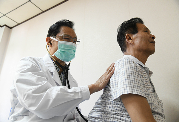 2018年8月2日,钟南山院士在广州医科大学附属第一医院的诊室内为患者检查。新华社记者邓华摄