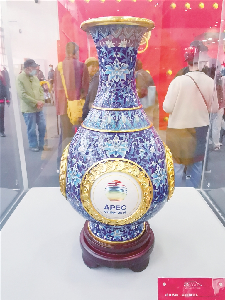 展品中有一件名为“四海升平”的景泰蓝赏瓶,吸引许多人驻足观赏。这款“四海升平”景泰蓝赏瓶在2014年APEC峰会上,作为国礼赠予国际友人。2014年11月11日,北京雁栖湖畔,水映山色,风光旖旎,亚太经合组织(APEC)第二十二次领导人非正式会议在此举行。