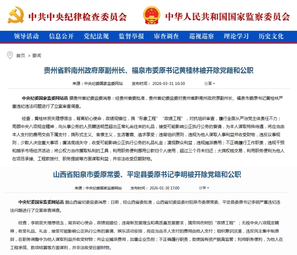 2026年3月,中央纪委国家监委网站共发布41名党员、干部党纪政务处分信息。其中,中管干部3名,中央一级党和国家机关、国企和金融单位厅局级干部5名,省管干部33名。