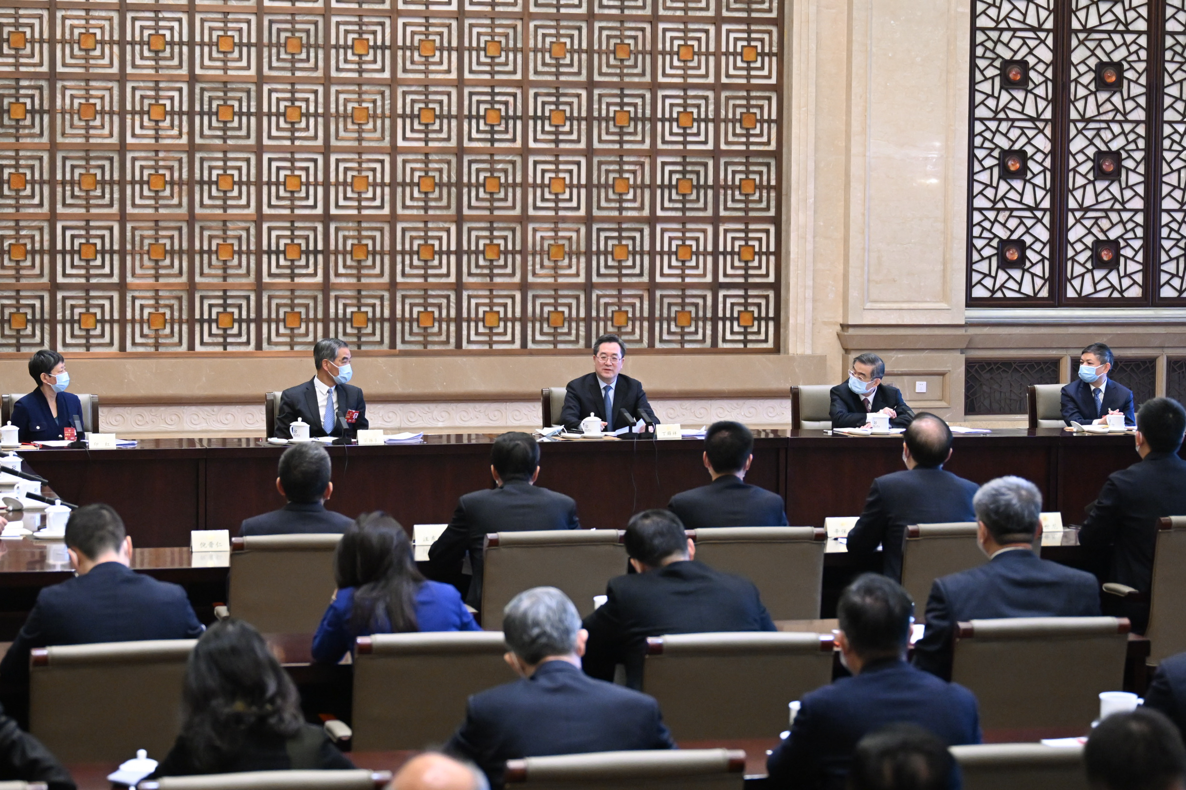 3月6日,中共中央政治局常委、中央办公厅主任丁薛祥看望出席全国政协十四届一次会议的环境资源界委员并参加讨论。 新华社记者 谢环驰 摄