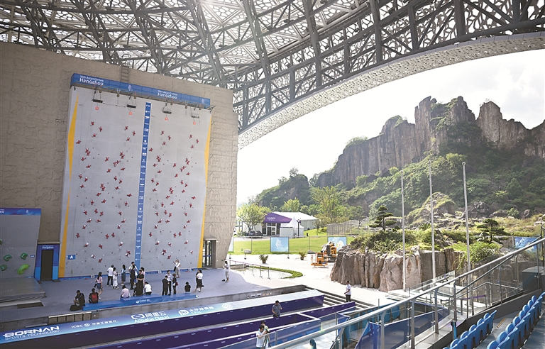 “羊山馆”即羊山攀岩中心,是杭州亚运会攀岩项目唯一竞赛场馆,因坐落于羊山脚下而得名。这里曾是一个废弃矿坑,周边散落着民居、旧厂房和菜地。历经两年设计施工,一个形如镂空蚕茧、别具江南韵味的国际比赛场馆拔地而起。