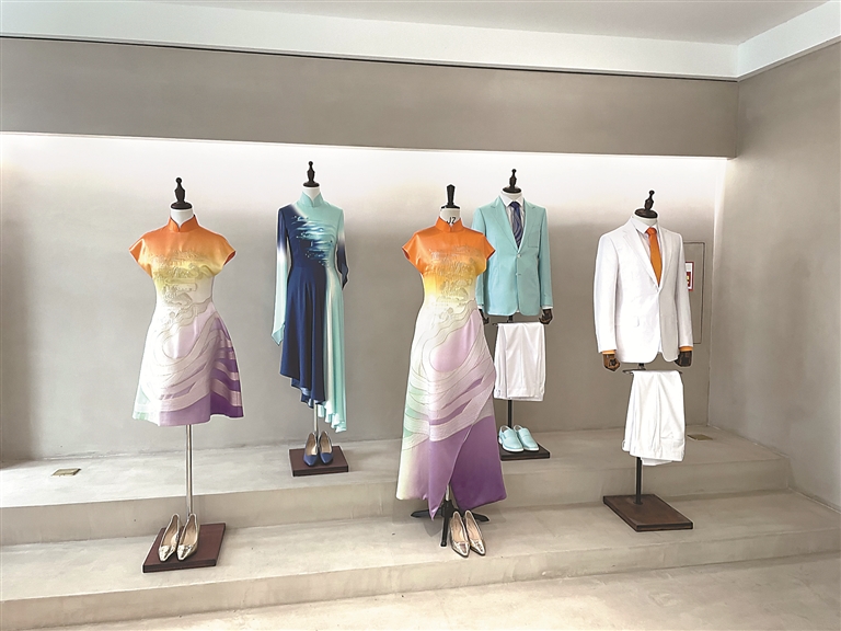 色彩以“虹韵紫、月桂黄、水墨白、湖山绿”为底,图案以西湖十景写意……博亚服饰有限公司一楼展厅展示的杭州亚运会颁奖礼服,尽显杭州韵味。 本网记者 瞿芃 摄