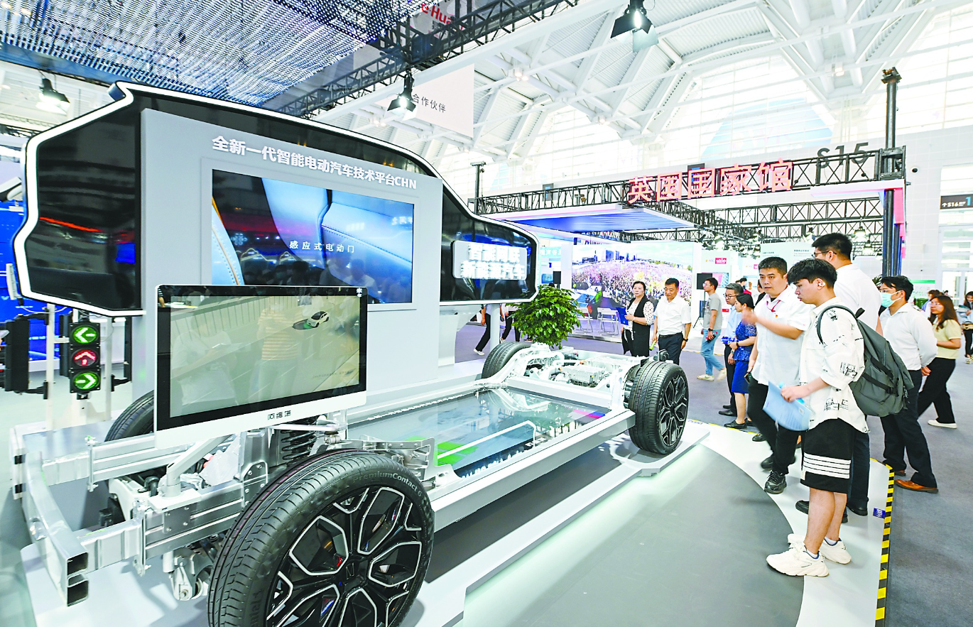进入创新型国家行列,标志着我国科技发展已经从跟踪模仿为主,转向跟跑并跑领跑“三跑并存”且并跑领跑日渐增多的历史性新阶段。图为近日,观众在第七届世界智能大会参观国产智能电动汽车技术平台。新华社记者 孙凡越 摄