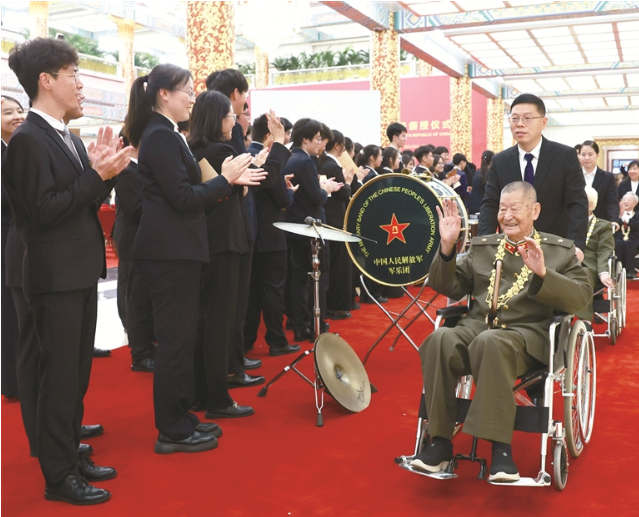 “共和国勋章”获得者黄宗德17岁入伍投身革命,在渡江战役、江西剿匪、抗美援朝战争中冲锋在前、屡立战功。在颁授仪式上,93岁的黄宗德被搀扶起身:“千千万万的革命英烈,他们为了民族独立、国家富强,牺牲了自己的宝贵生命。今天这份崇高的荣誉同样属于他们。”
